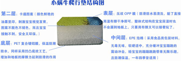 小蝸牛爬行墊無毒無味,防潮隔濕,超大無縫,表面附帶精美的童話圖案,從寶寶學(xué)爬到練習(xí)走路,再到大點(diǎn)在地上玩耍蹦跳,都是不錯(cuò)的選擇,是寶寶健康快樂成長的好伴侶。