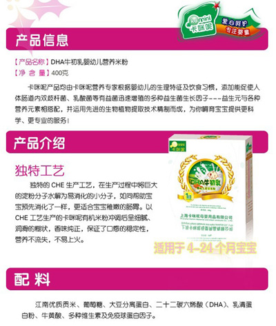 卡咪呢有機米粉系列是專為中國寶寶設(shè)計的營養(yǎng)輔食,選用有機大米,科學搭配維生素AD等維生素,還特別添加;撬帷HA、AA等有助智力發(fā)育的營養(yǎng)成分,富含15種營養(yǎng)素,F(xiàn)上?ㄟ淠啬笅胗闷酚邢薰久嫦蛉珖瞻资袌鰠^(qū)域誠招卡咪呢有機米粉代理商。