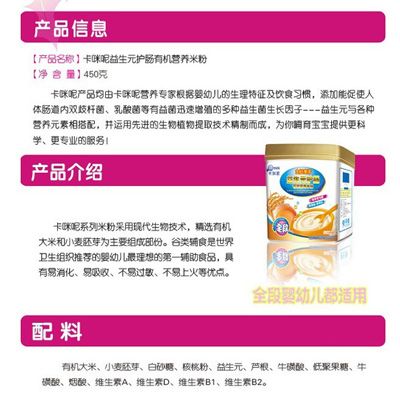 卡咪呢有機米粉系列是專為中國寶寶設計的營養(yǎng)輔食,選用有機大米,科學搭配維生素AD等維生素,還特別添加;撬、DHA、AA等有助智力發(fā)育的營養(yǎng)成分,富含15種營養(yǎng)素,F(xiàn)上?ㄟ淠啬笅胗闷酚邢薰久嫦蛉珖瞻资袌鰠^(qū)域誠招卡咪呢有機米粉代理商。