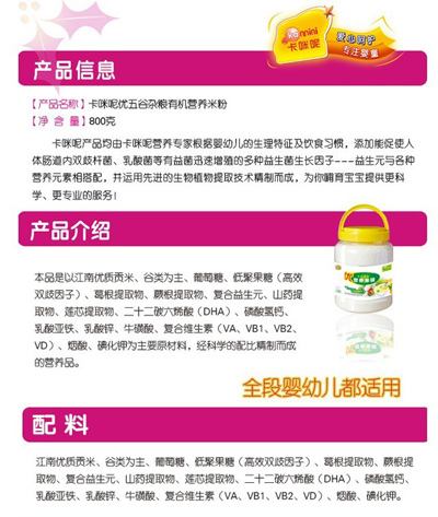 卡咪呢有機(jī)米粉系列是專為中國寶寶設(shè)計的營養(yǎng)輔食,選用有機(jī)大米,科學(xué)搭配維生素AD等維生素,還特別添加;撬帷HA、AA等有助智力發(fā)育的營養(yǎng)成分,富含15種營養(yǎng)素,F(xiàn)上海卡咪呢母嬰用品有限公司面向全國空白市場區(qū)域誠招卡咪呢有機(jī)米粉代理商。