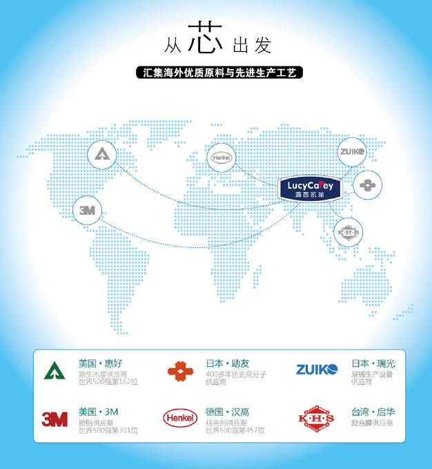 LUCYCAREY露茜凱瑞紙尿褲選用全球頂尖供應(yīng)商的紙尿褲原材料:住友、三大雅高分子吸水材料;美國3M魔術(shù)貼;德國萊卡松緊帶;美國進(jìn)口原生木漿;德國漢高粘合劑;美國、日本進(jìn)口無紡布;進(jìn)口超柔軟透氣底膜等。另外,全世界zui先進(jìn)的全自動紙尿褲生產(chǎn)線,年產(chǎn)銷數(shù)億片紙尿褲的成熟的生產(chǎn)制造團(tuán)隊(duì),確保產(chǎn)品高品質(zhì)。