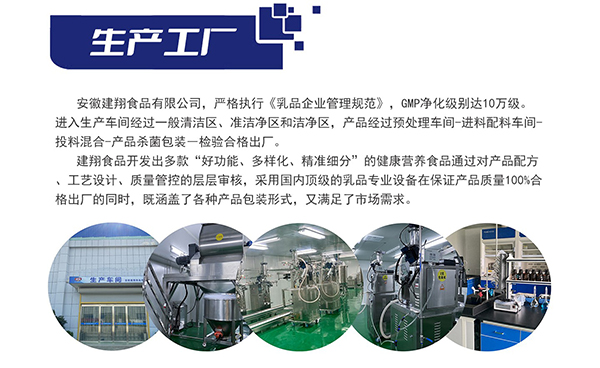 作為2020年安徽省重點(diǎn)招商引資的乳制品專(zhuān)業(yè)企業(yè),建翔食品自2003年成立以來(lái),深耕健康食品領(lǐng)域,是安徽省唯一一家調(diào)制乳粉工廠,更是國(guó)內(nèi)專(zhuān)業(yè)的健康食品解決方案供應(yīng)商,集研發(fā)、生產(chǎn)、銷(xiāo)售于一體,專(zhuān)注為客戶(hù)提供奶粉OEM/ODM全鏈條服務(wù)。