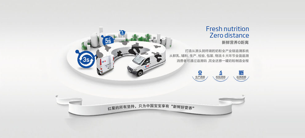 紅星奶粉追溯從源頭做起,打造從源頭到終端的奶粉全產(chǎn)業(yè)鏈追溯系統(tǒng)。從鮮乳、輔料、生產(chǎn)、檢驗、包裝、物流6大環(huán)節(jié)全面追溯,消費者可通過追溯碼,完全還原一罐奶粉的一生。
