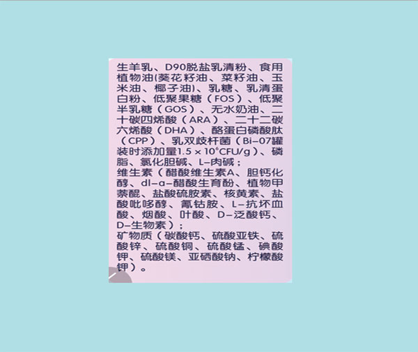 蓓萌羊奶粉是新政后工廠生存和發(fā)展的核心品牌,采用的高山牧場(chǎng)奶源,純凈安全,添加OPO結(jié)構(gòu)脂和D90脫鹽乳清粉,全面提升寶寶成長(zhǎng)發(fā)育所需營(yíng)養(yǎng)和對(duì)營(yíng)養(yǎng)的吸收及利用,同時(shí),采用國(guó)際國(guó)內(nèi)先進(jìn)的生產(chǎn)技術(shù)和產(chǎn)品檢測(cè)技術(shù),專注每一罐蓓萌羊奶粉的安全品質(zhì),呵護(hù)每一位寶寶健康成長(zhǎng)。